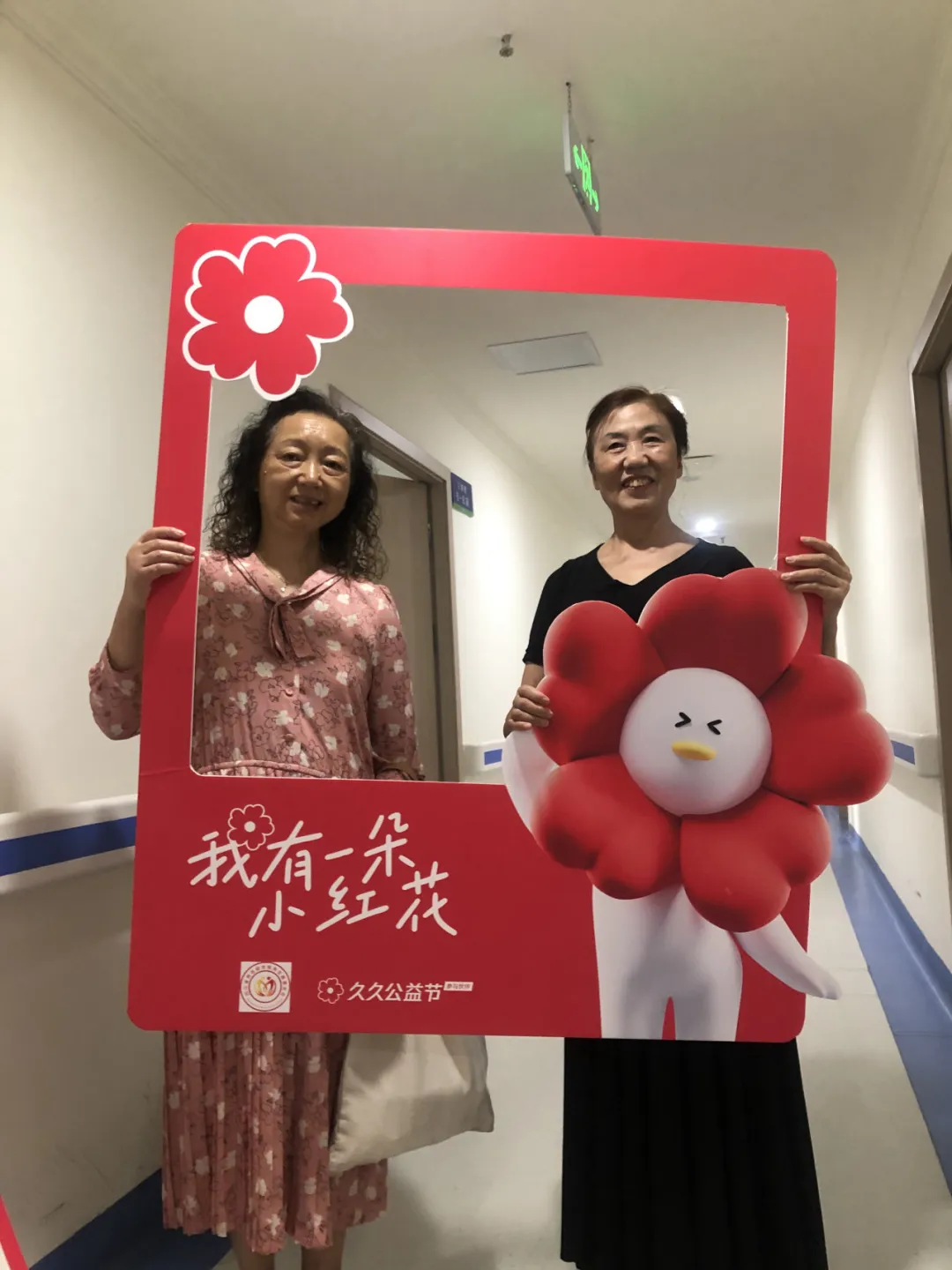 活动现场还设置了拍照打卡区域,两位老人手持写有 “我有一朵小红花” 字样的久久公益节打卡道具合影留念,留下了美好的瞬间,也让老人们感受到了活动的趣味性和仪式感。